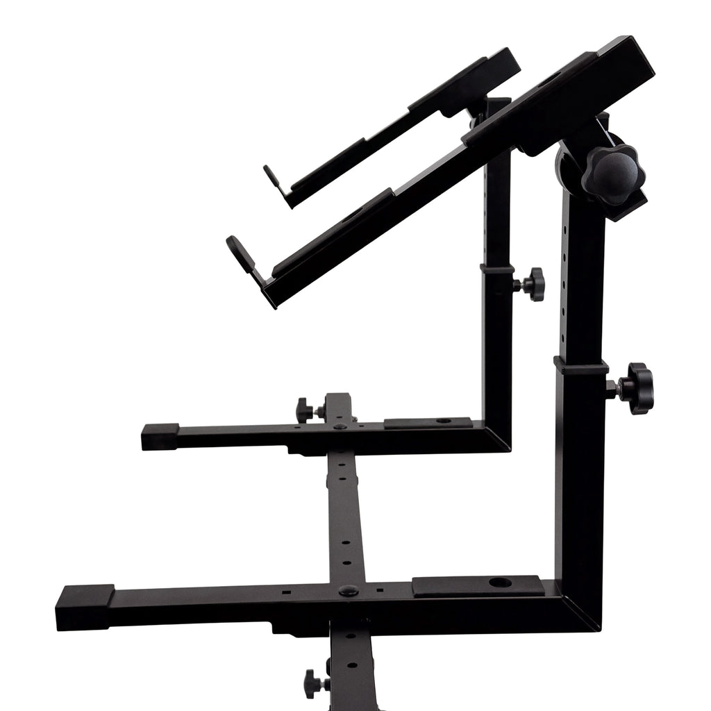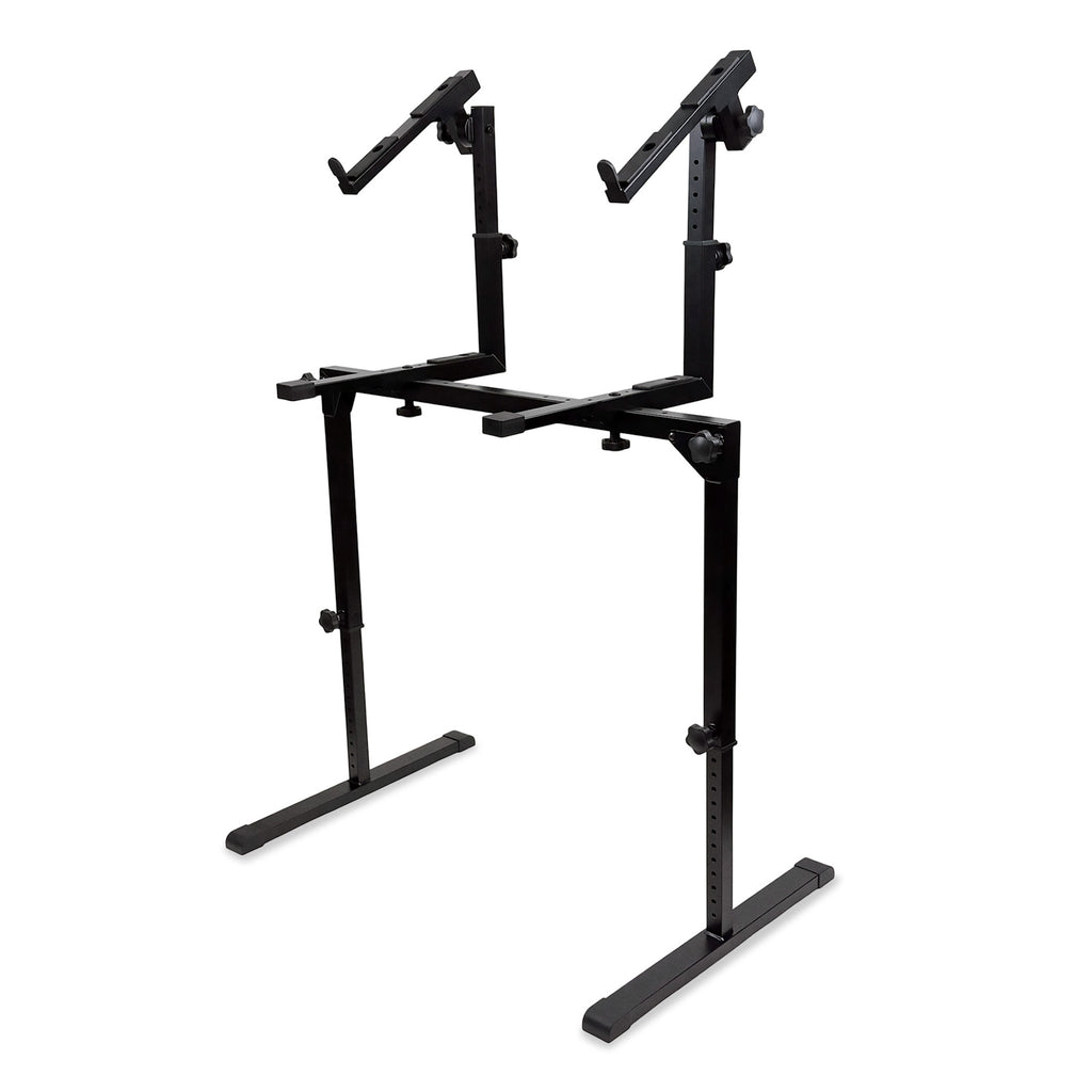 The stand is equipped with 19" depth support arms, providing a stable foundation for even the largest and heaviest keyboards. The upper tier arms are 14" depth, with selectable tilt angle for optimal access to your gear, and can be raised up to a max height of 65".