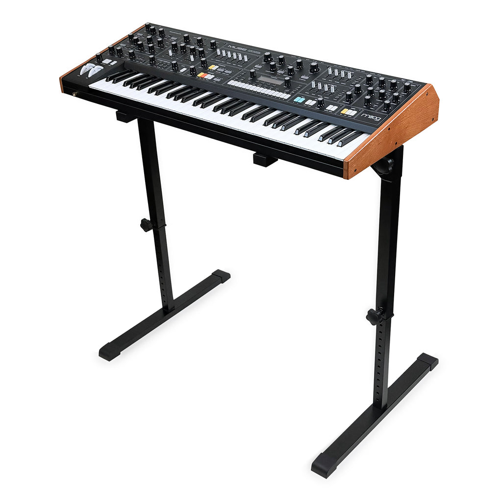 The stand base is anchored by 25" feet, maintaining stability within the full range of height adjustment. If you use heavy (and expensive) analog synths, you'll definitely appreciate the extra support and durability.